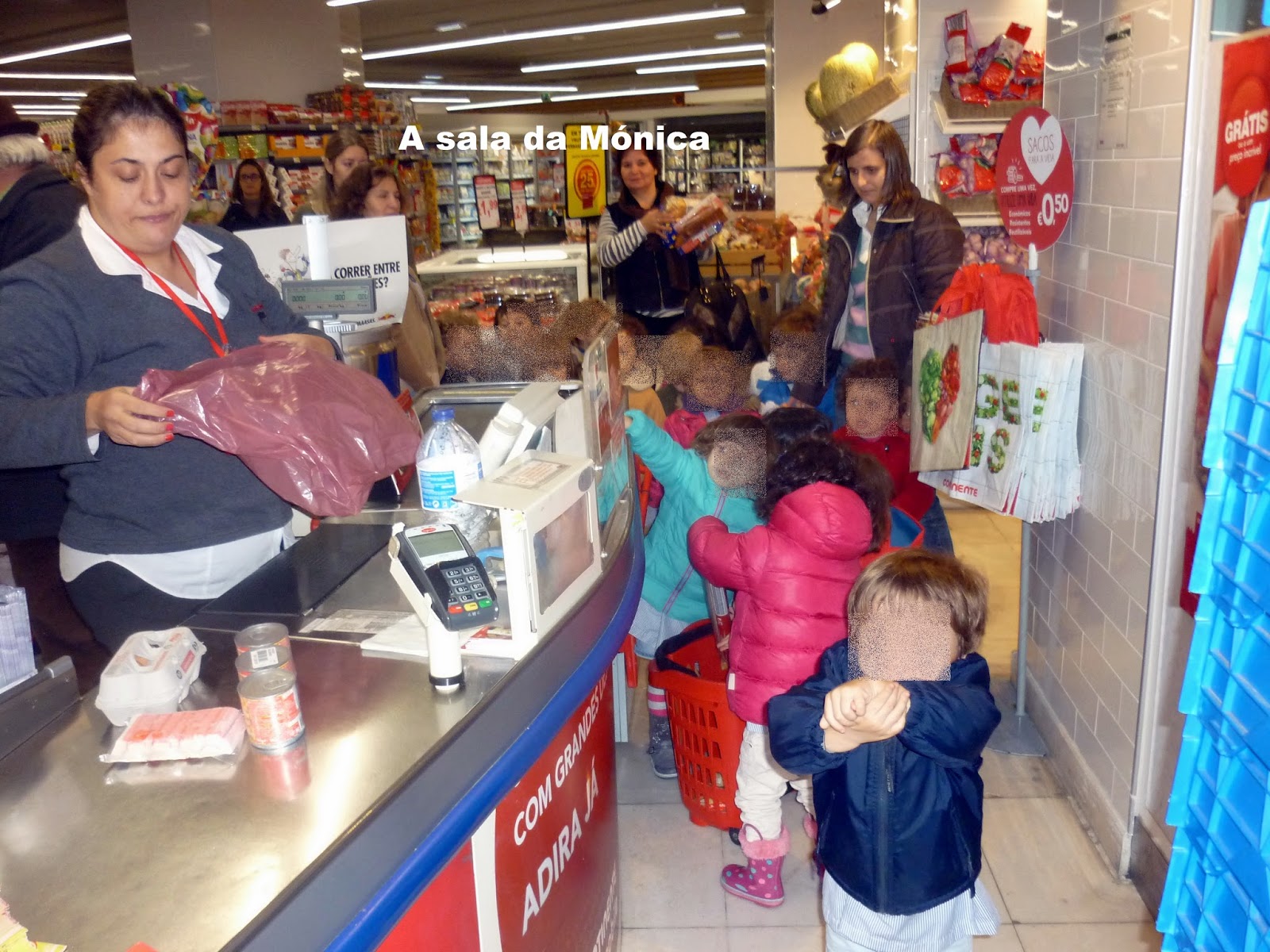 Quando percebemos que já tínhamos comprado tudo fomos para a fila de supermercado, esperamos pela nossa vez, colocamos as compras no tapete...