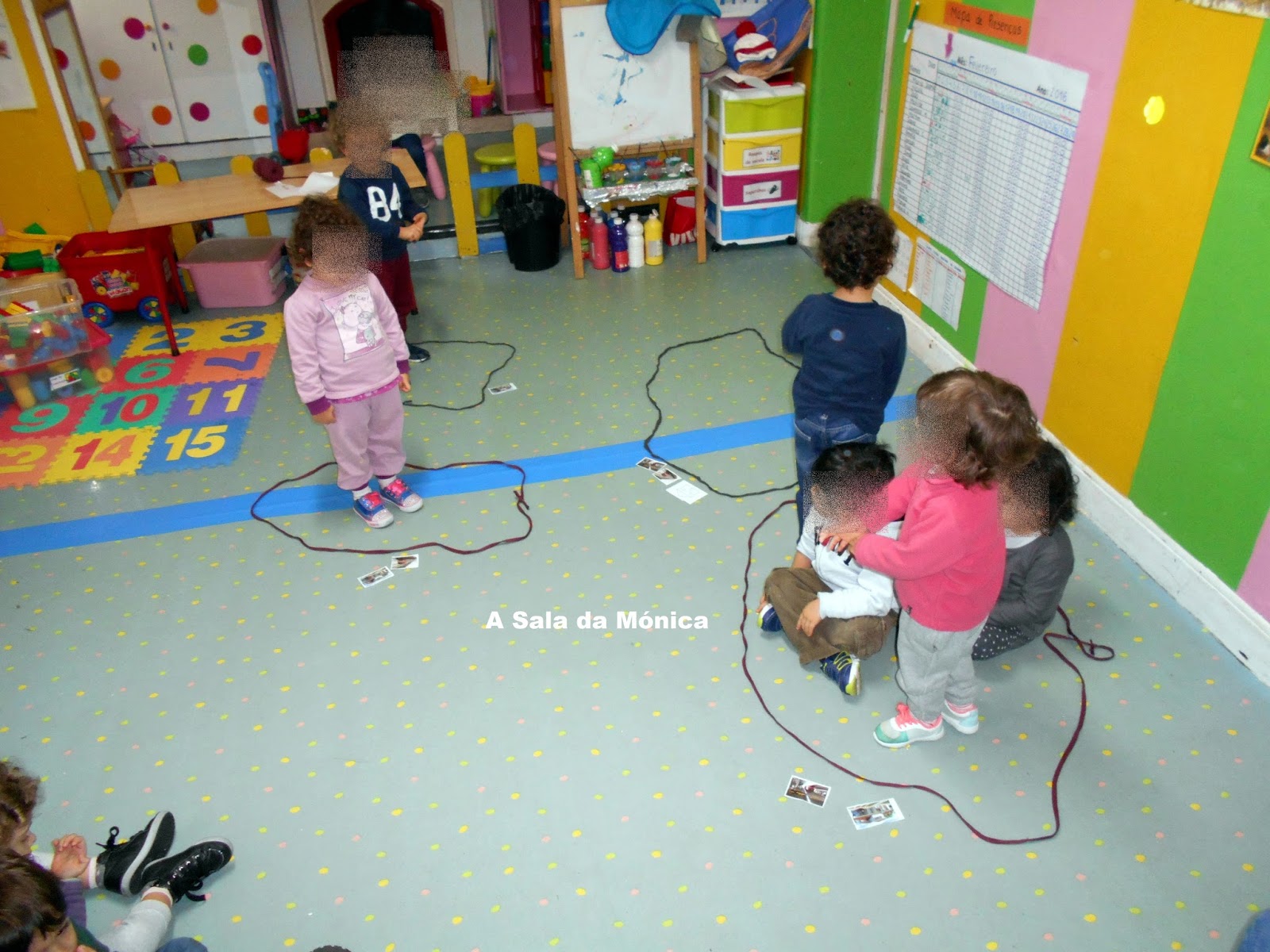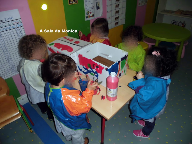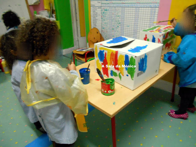 Com a ajuda da família arranjamos caixas e já começamos a pintar o comboio.